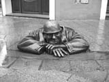 ATMを見付けて現地通貨を引き出した彼は、ゆっくりと朝食のとれるような店を探していたが、まだまだ準備中の店ばかりだ。そうこうするうちに、とうとう雨が落ちてきてぽつぽつと彼を濡らす。昨夜の疲れと、空腹によるひもじさが一気に彼を襲う。マンホールから頭をのぞかせた男の銅像が、バカにしたような笑みをうかべて彼を見上げていた。旧市街を通り抜けてしまった彼は、どんよりと流れるドナウ川を眺めていた。この時彼の頭の中では、こんなフレーズが繰り返し繰り返し流れていた。
